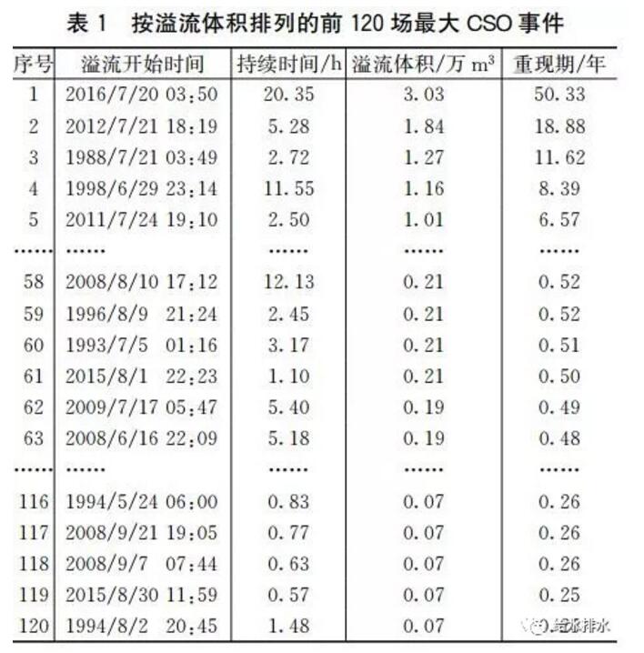 按照溢流體積從大到小將CSO事件進行降序排列,并選取前N場最大CSO事件,N=βm,其中,β為每年選取CSO事件的個數,按年多個樣法,本案例β取值為4,m為模擬年數30年。每場CSO事件溢流體積對應的重現期T=(m+1-2α)/(i-α)[9],其中i為CSO事件按溢流體積從大到小排列的序號,α為權重因子,取04,計算結果如表1所示,其中,重現期T也可根據式T=(mβ+1)/iβ計算。