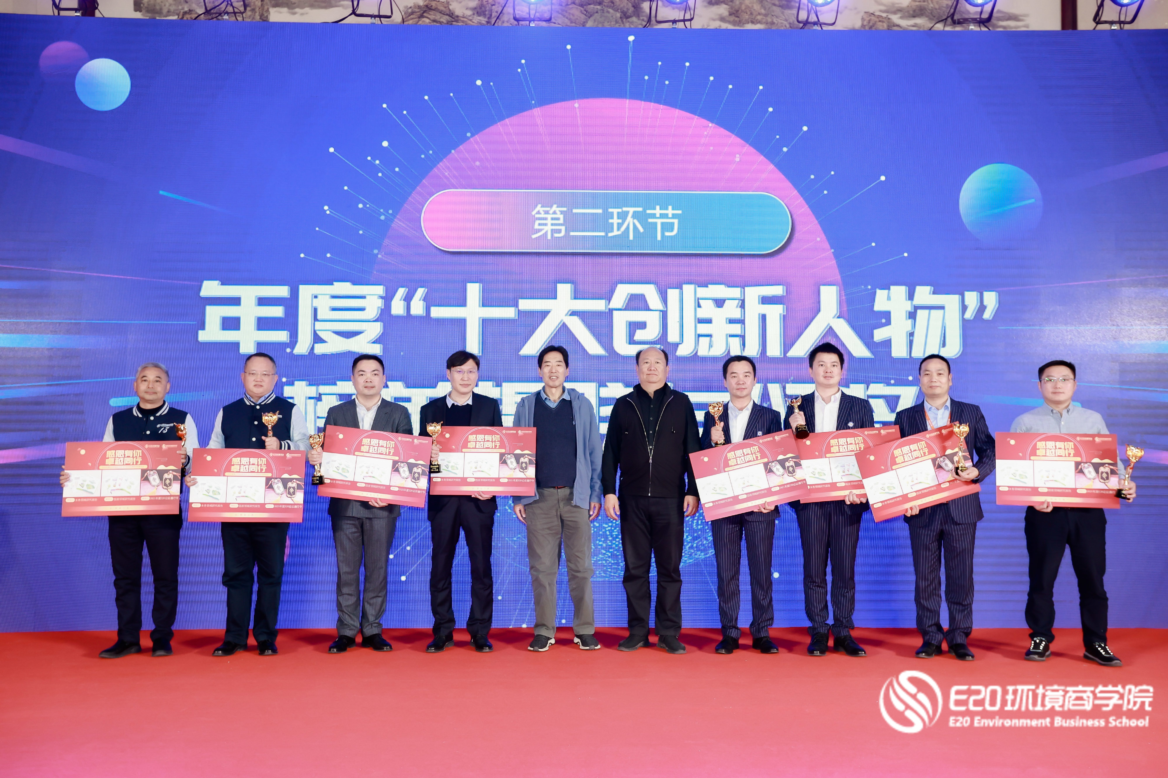 感恩年會上進行了E20環境商學院2020年度(第二屆)創新人物榜單揭曉與頒獎。銀江環保董事長葉偉武憑借“產品創新、模式創新”贏取超高人氣,現場捧回“十大創新人物”、“創新分享獎”、“最佳人氣獎”三大獎項。